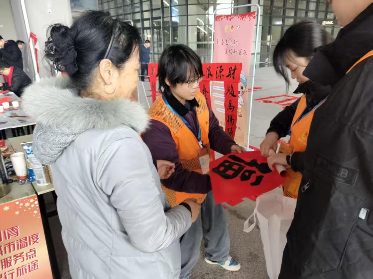 新能源材料与器件2541胡雪丽同学积极参与重庆东站“文化暖冬”志愿服务活动,承担写春联、送春联、递姜茶等暖心任务,让中华优秀传统文化在流动的旅途中焕发新活力。