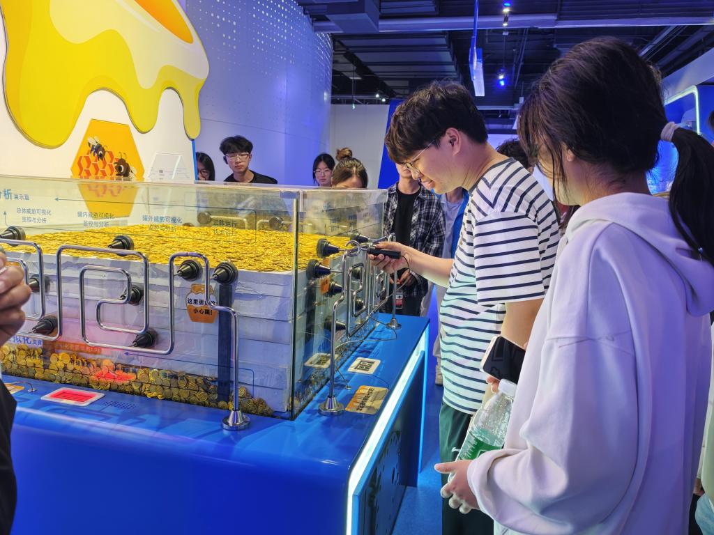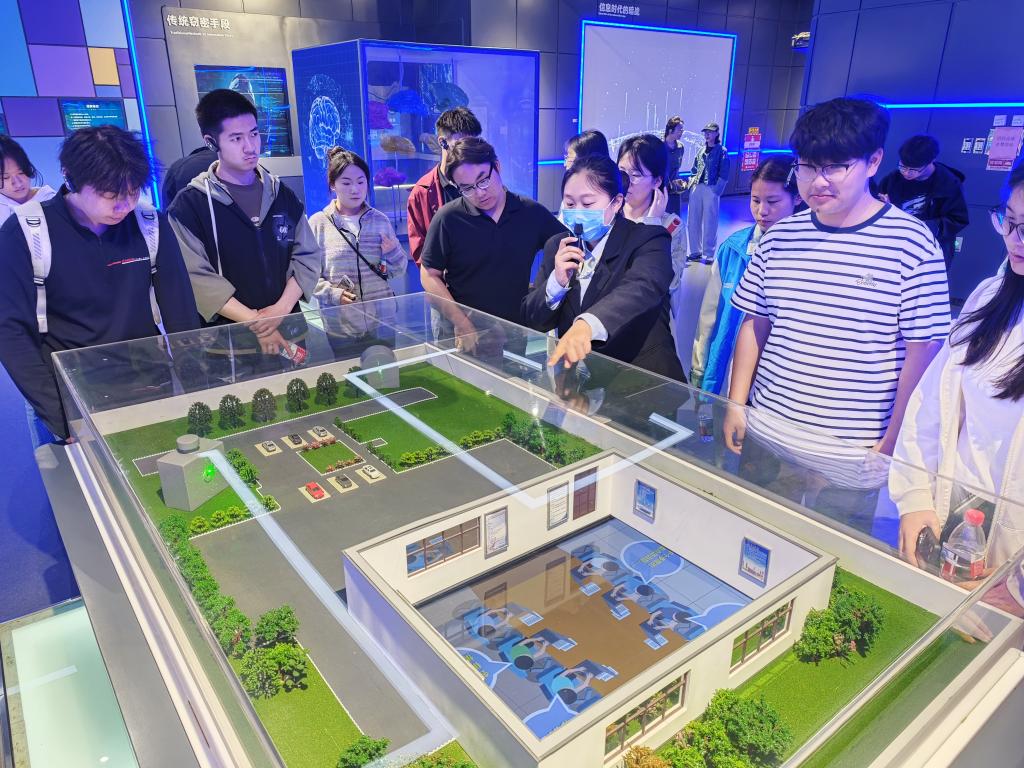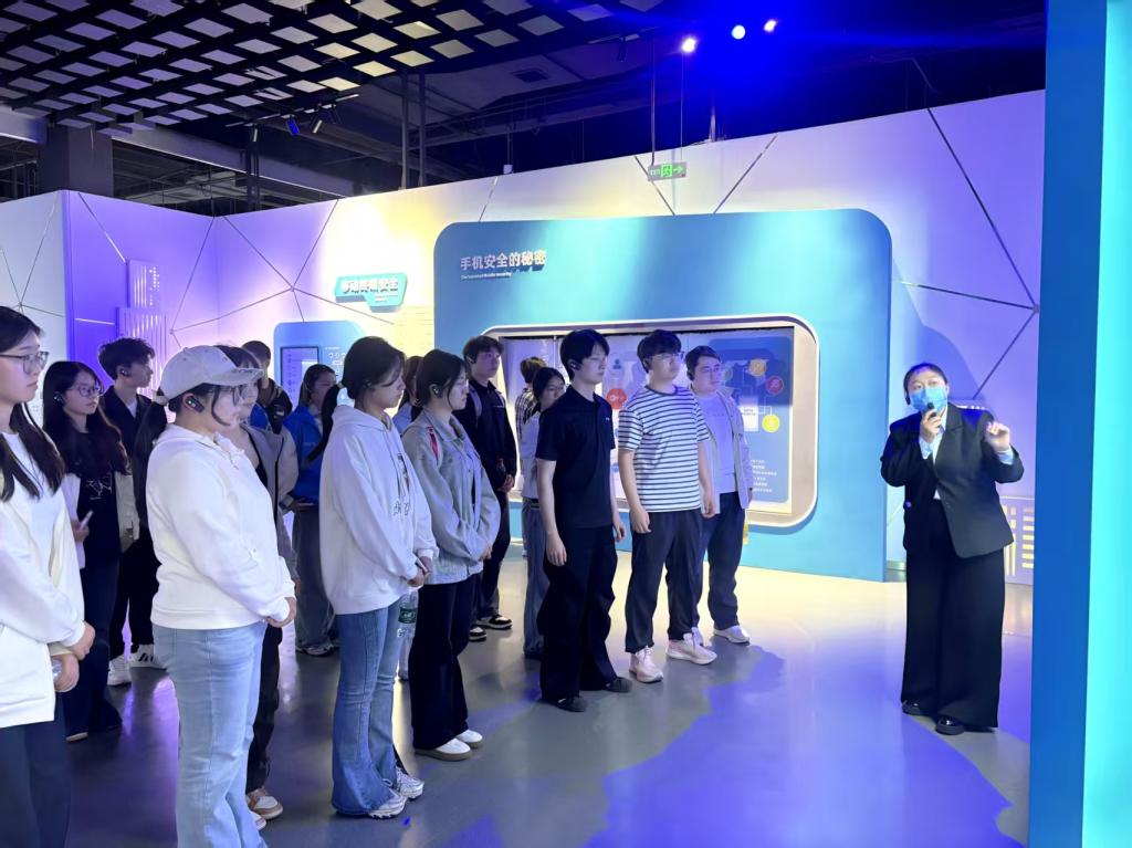 作为国内首个以“网络空间安全”为主题的科普基地,设有个人安全、政企安全、社会安全、综合竞技四大主展区,共200余个展项和1700余件展品。在讲解员的带领下,青马班学员们依次参观了网络安全演练区、黑客密室、网安之心等多个特色展厅,近距离接触了涵盖计算机、通信、网络安全、人工智能等多个领域的展品,深入了解网络安全发展历程、前沿技术应用及各类安全风险防范知识。在网络安全演练区,讲解员结合馆内展陈的网络信息泄密案例,详细拆解了不法分子通过植入恶意插件、破解弱密码、利用系统漏洞等手段非法入侵信息系统的全过程。在AI反诈互动区,学员们踊跃体验互动设备,亲身感受网络新型诈骗的迷惑性与隐蔽性;在数据攻防模拟区,激烈的虚拟攻防演示引发了阵阵惊叹。