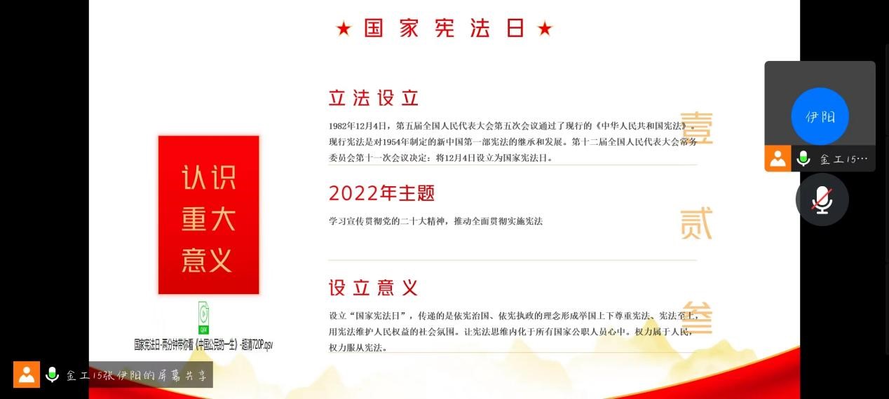 今年12月4日是第九个国家宪法日,为深入学习宣传贯彻党的二十大精神,弘扬宪法精神,维护宪法权威,12月4日中午,经济贸易学院举办以“弘扬宪法精神,建设法治中国”为主题的线上理论宣讲活动。此次宣讲由学院团委理论宣讲团成员张伊阳主讲,75名学生积极参与。