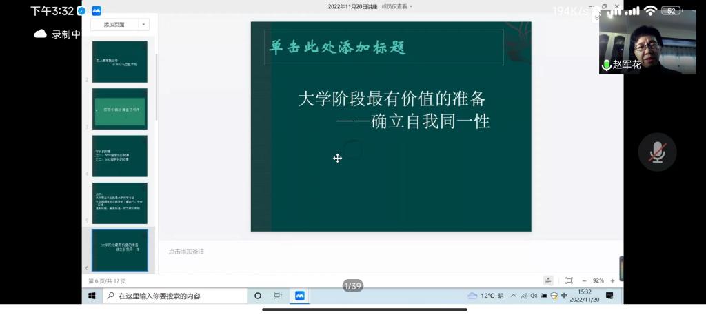 国家二级心理咨询师、中文副教授赵军花老师首先为同学们分享了两届学长们的故事,带给大家启示:未来职业未必是大学所学的专业。建议同学们在大学期间要尽可能多的了解自己,多去实践,选我所爱,爱我所选,努力做出成绩。并重点阐述了“确立自我同一性”的理论观点,强调要在大学阶段做最有价值的准备,让自己拥有持续幸福感与意义感的人生。在随后的答疑环节中,同学们纷纷就自己关心的问题向老师提问,赵军花老师从专业角度出发耐心细致地为同学们答疑解惑。