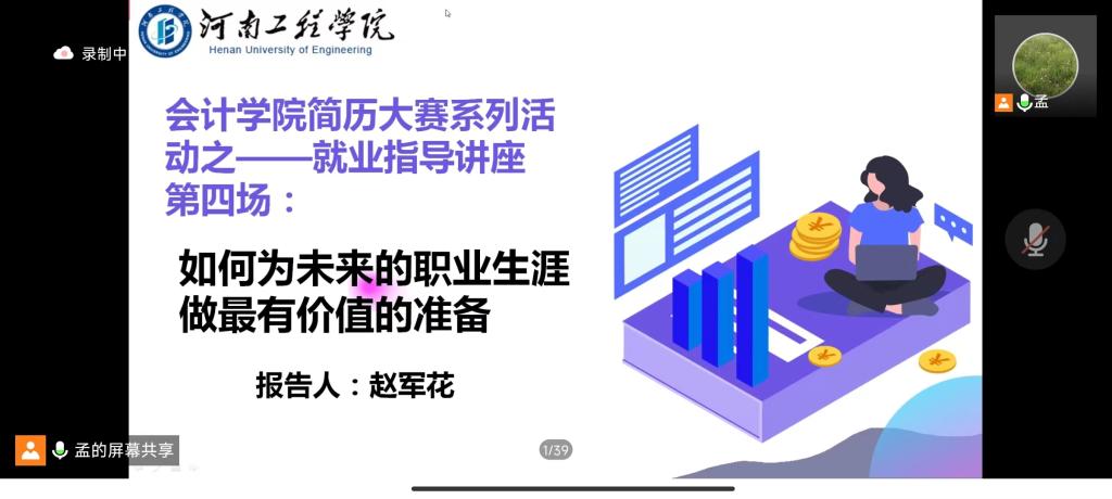 “职”赢未来,从心做起。会计学院于2022年11月20日下午举办2022年简历大赛就业指导系列讲座第四场:如何为未来的职业生涯做最有价值的准备。此次讲座依旧以采取线上腾讯会议的方式进行。会计学院党委书记程光、党委副书记张维、就业指导专家赵军花以及会计学院在校生600余人参加会议,会议由2019级辅导员孟平老师主持。