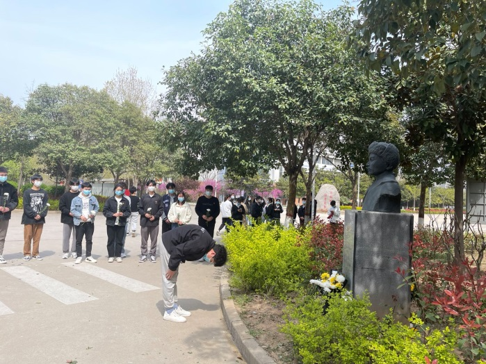 紧接着,全体人员移步至雷锋雕像前,由豆浩然同志致哀悼词,全体人员向雷锋同志表达缅怀与敬佩之情。最后,由党员代表王一帆同志发言,表示我们会将无数英烈的精神传承下去,用青春力量守护好我们来之不易的幸福生活。