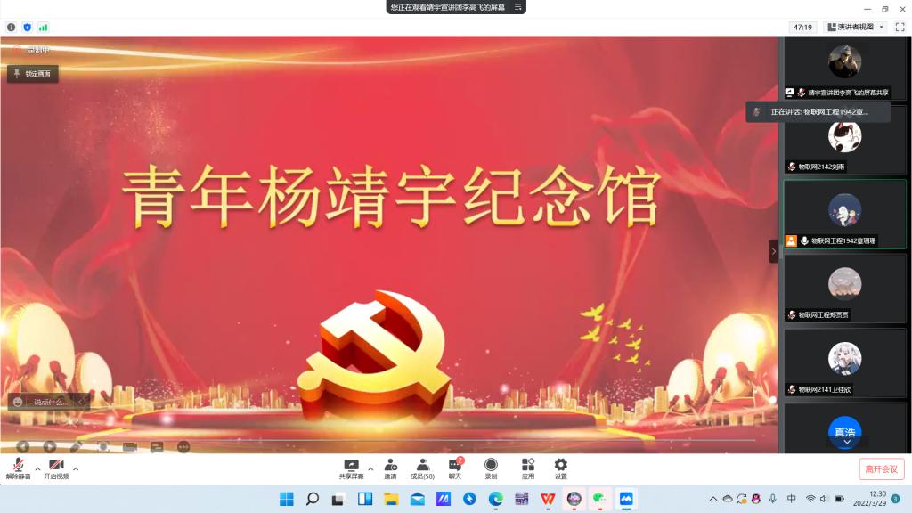 3月29日中午,计算机学院开展了以弘扬“靖宇精神”为主题的线上宣讲活动,校团委靖宇宣讲团李高飞同学担任主讲人,计算机学院团委副书记章珊珊主持会议,学院团委书记游利锋、靖宇团课学员及21级团员骨干参加了此次活动。