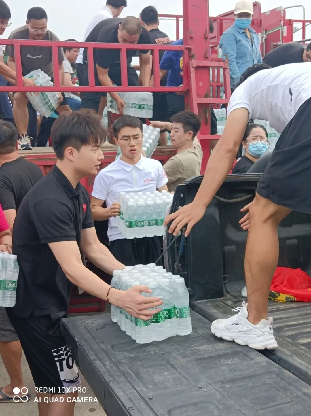 王睿星,化工与印染工程学院轻化工程2042班,因在郑州打工,假期滞留在了郑州。亲眼目睹了这次大暴雨带来的灾害。路面大面积积水,行人被困,车辆被浸泡.....7月22号晚,王睿星所在的打工地点世嘉健身组织对从商丘出发经连霍高速到郑州服务区的饮用水车进行志愿活动,王睿星与一些同事积极报名。7月23号上午十点,下午三点到达郑州服务站帮助进行抬取物资,现场大家都牟足了力气,齐心协力,两卡车的的水不一会就卸了下来。这些志愿者并不害怕工作的辛苦,一心想为灾区贡献自己的一份力。