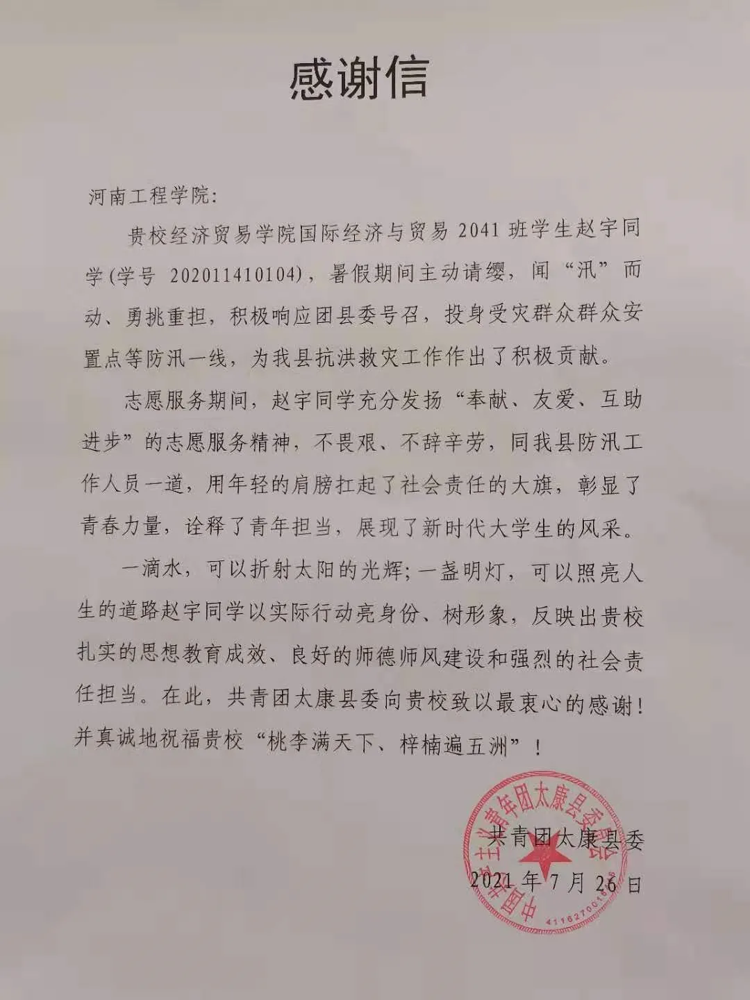 赵宇,经济贸易学院国际经济与贸易2041班学生,入党积极分子。在强烈的职责感和使命感的驱使下积极投身防汛救灾应急志愿服务活动中。起初,他积极在各个救援群中联络并转发各类求助信息,虽然势单力薄,但也要尽自己的一点努力!在7月21日扶沟的受灾群众已经开始在政府的安排下转移到太康县的常营镇。把物资搬到救援车上,救援车再运到受灾乡镇。7月23日前往芝麻洼和板桥当志愿者,7月24日在共青团太康县委的领导下前往常营镇,7月25日继续前往常营镇第二初级中学,在对各个单位和企业以及个人的捐赠的进行物资的装卸,并帮助受灾群众安置住处,到中午以及晚饭的饭点帮助受灾群总打饭以及刷碗