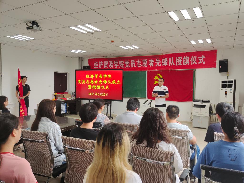 为深化党史学习教育,强化党的初心宗旨,扎扎实实开展好“我为群众办实事”专题实践活动,6月25日中午,经济贸易学院在9号楼会议室举行党员志愿者先锋队授旗仪式。学院党委副书记赵方、李载东,各学生党支部书记以及新接收的47名党员共同参加此次活动,会议由党建专职组织员李津主持。
