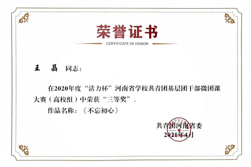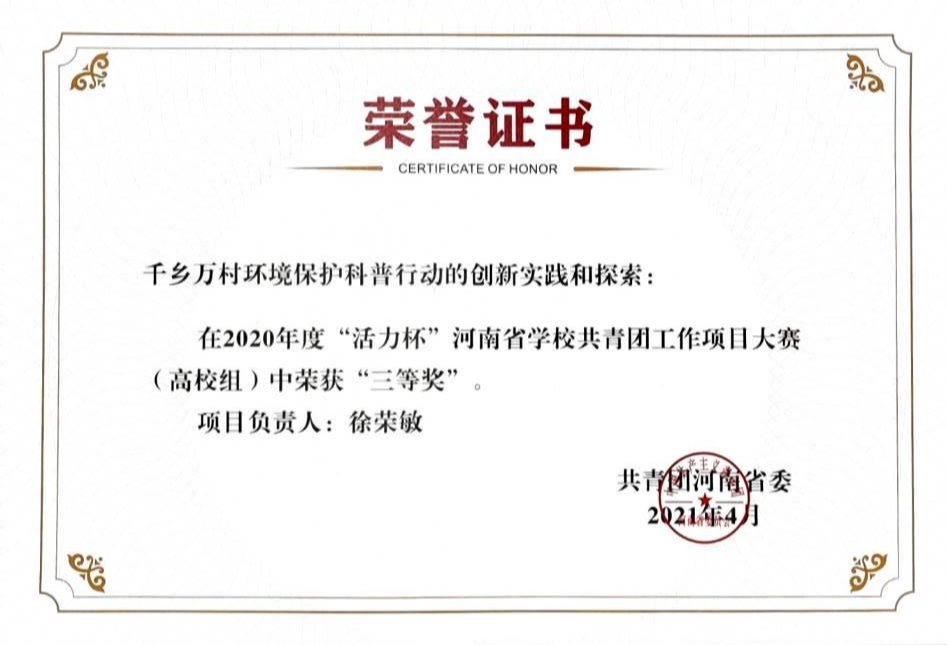 我校经组织申报、初选推荐、省级评审、网络投票等环节,共上报6组共青团创新项目,“活力团支部 魅力团支书”各5组,微团课3组。2021年3月29日,大赛成绩揭晓,我校上报的“弘扬靖宇精神,讲好红色故事”、“千乡万村环境保护科普行动的创新实践和探索”共青团创新项目获得2020年度“活力杯”河南省学校共青团创新项目大赛(高校组)“三等奖”;“不忘初心(王晶老师)”的微团课在2020年度“活力杯”河南省学校共青团基层团干部微团课大赛(高校组)荣获“三等奖”;“河南工程学院财务管理1842团支部”、“河南工程学院电子商务1841团支部”荣获“活力杯”河南省学校共青团“活力团支部”大赛(高校组)百优“活力团支部”;李佳琦同学、梁佳琪同学荣获“活力杯”河南省学校共青团“魅力团支书”大赛(高校组)百优“魅力团支书”。