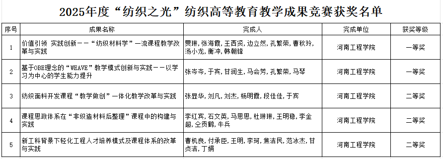 在2025年度“纺织之光”纺织高等教育教学成果竞赛中,纺织工程学院再创佳绩,获得一等奖2项、二等奖3项。本次大赛共收到来自东华大学、天津工业大学、江南大学、苏州大学等全国80多所高校1000多项优秀教育教学成果作品。