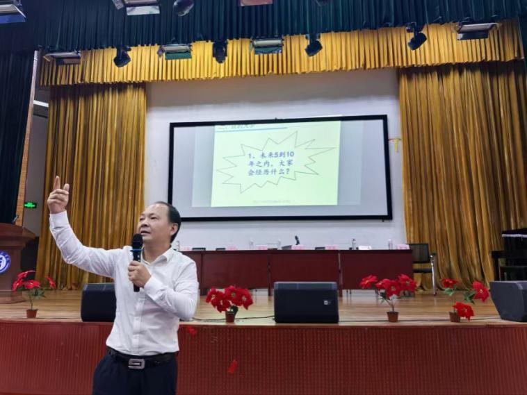 首先,李二亮以“爱这个国爱这个家”为主题,结合中国工业成就,用案例让家国情怀更具象,引导新生找准大学生活方向。互动中,他询问新生屏幕使用时长,关注日常学习生活习惯,还结合经验提建议,鼓励大家尽早规划学业与未来。