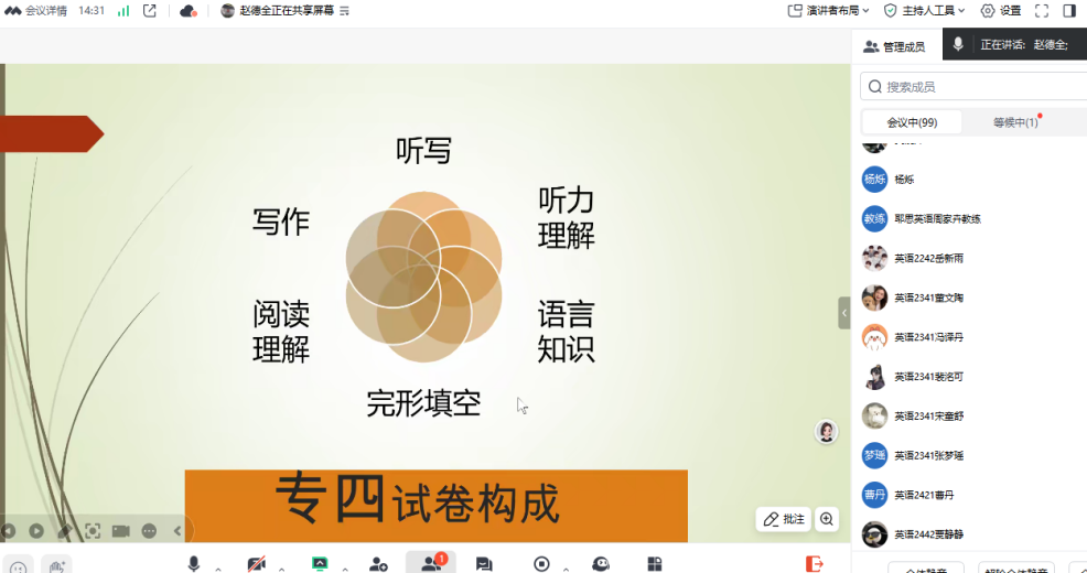 2025年6月4日晚,外语学院主办的“英语专四(TEM-4)备考策略”专家讲座顺利举行。特邀测评研究专家上海电力大学赵德全教授主讲,讲座在线上举行,外语学院即将参加英语专业四级考试的学生都积极聆听了讲座。
