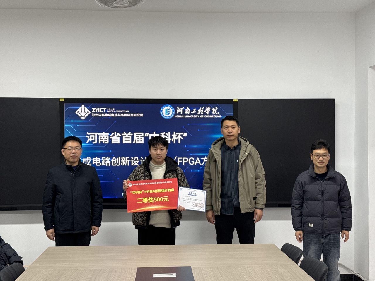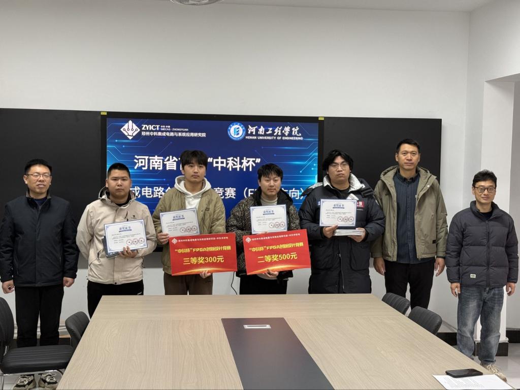 本次竞赛自2025年3月启动,经两个多月培训备赛,25余名学子参赛比拼,荣获最佳团体奖、最佳优胜奖、二等奖、三等奖,尽显专业素养与创新实力。12月22日郑州中科研究院产业化处靳彦磊主任,我院电子科学系主任武兴会、团委书记俞东于A03会议室出席仪式并为获奖同学颁奖。